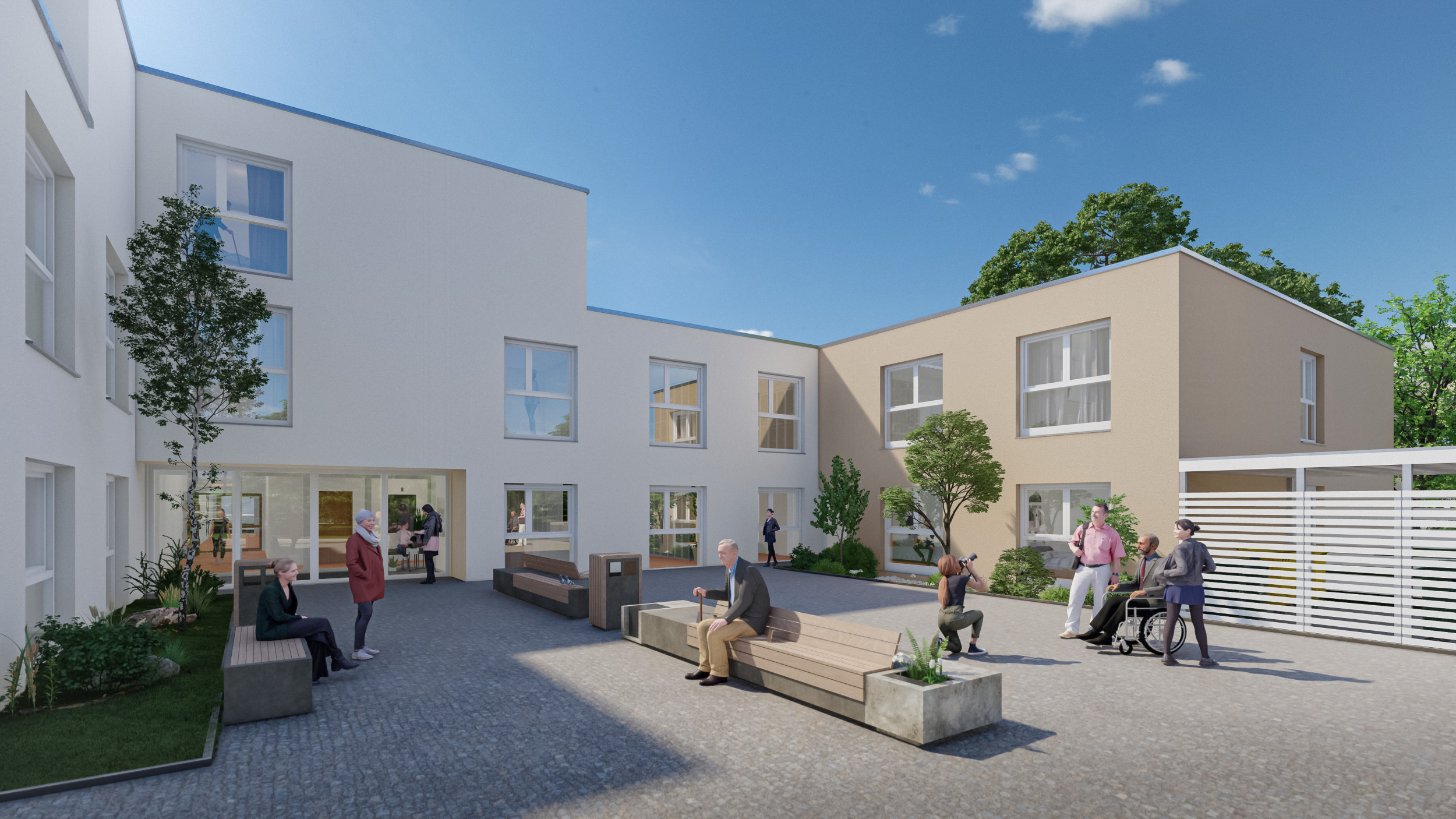 Die Außenanlagen werden überwiegend begrünt, im Bereich der Gemeinschaftsterrasse Pflege wird ein beschützter Garten gestaltet.