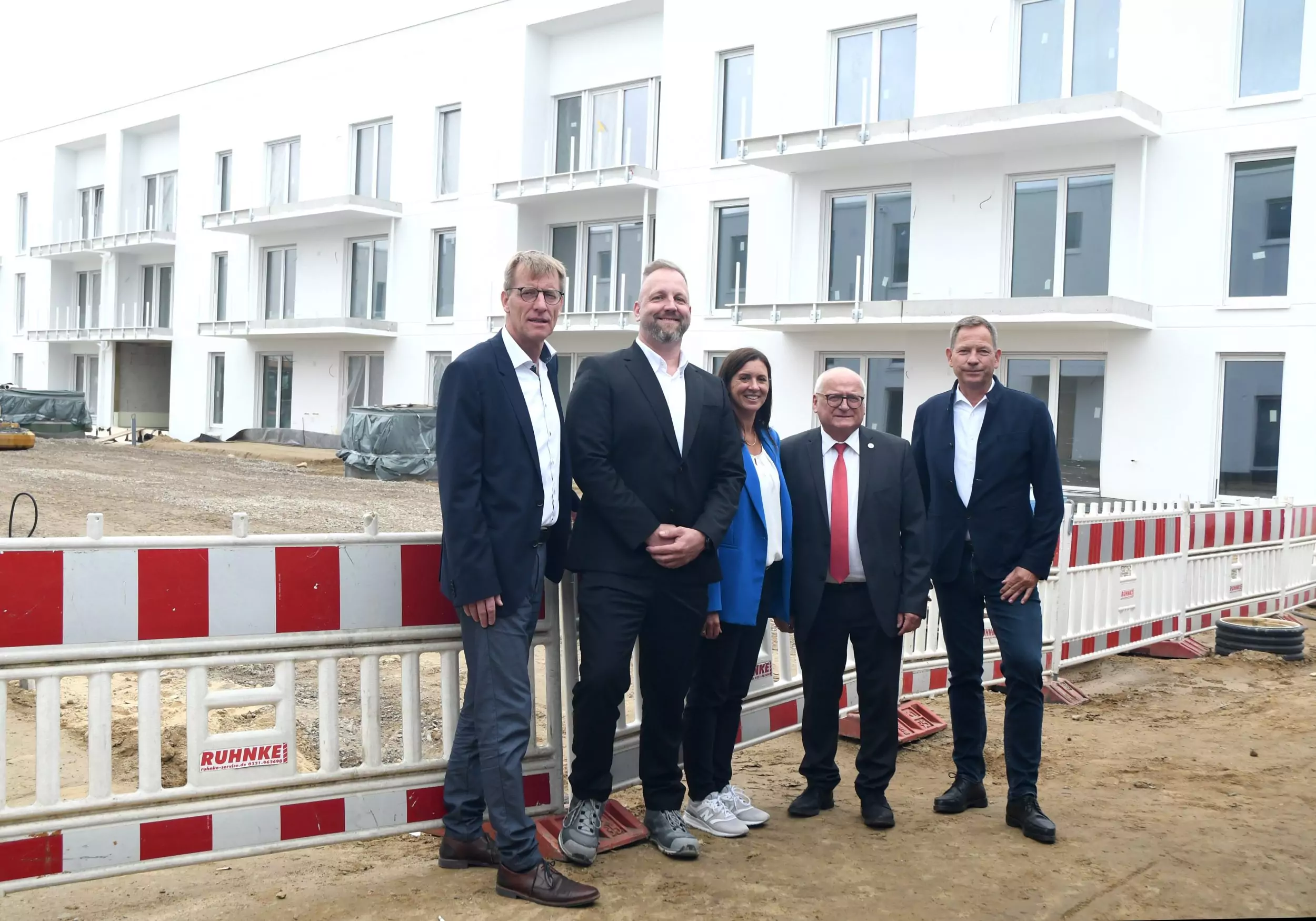 Erfolgreich durch gute Zusammenarbeit (v.l.): Bernd Supthut (Geschäftsführer Glöckle), Christoph Wurst (Leitung Bau, DIBAG), Carolin Glöckle (Geschäftsführende Gesellschafterin Glöckle), Christian Hentschel (Bürgermeister Schönefeld), Sebastian Kuhlen (Vorstand DIBAG); Bildquelle: DIBAG