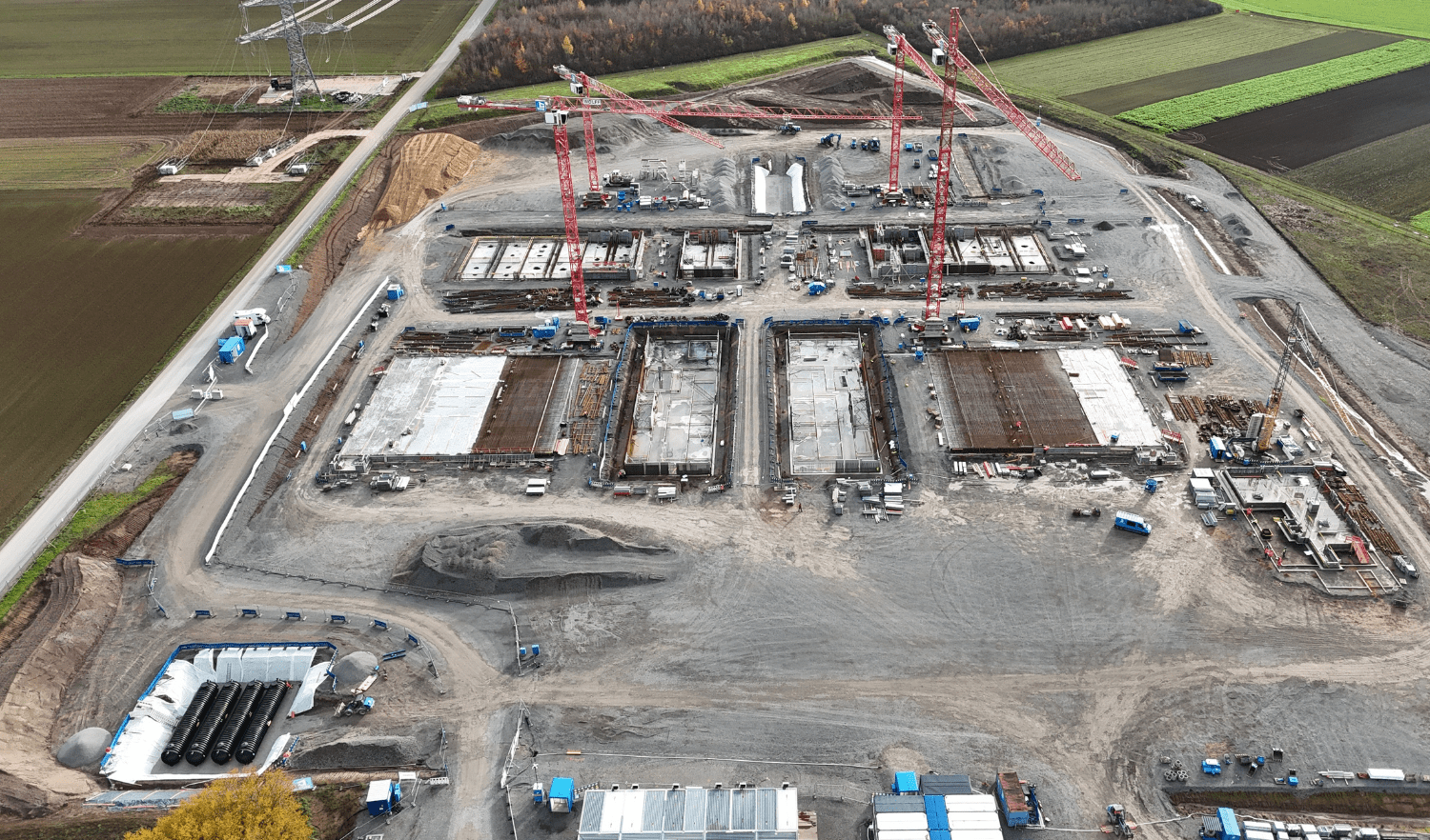 Der Hoch- und Ingenieurbau der Unternehmensgruppe Glöckle arbeitet auf dem rund 60.000 m² großen Gelände unter anspruchsvollen Rahmenbedingungen. Fünf Kräne sind parallel im Einsatz, viele Abläufe werden in internationaler Abstimmung koordiniert – die Vertragssprache ist Englisch. Besonders technisch herausfordernd sind die freistehenden Trafowände mit Höhen bis zu 11 Metern sowie die flüssigkeitsdichten Trafowannen aus Beton.