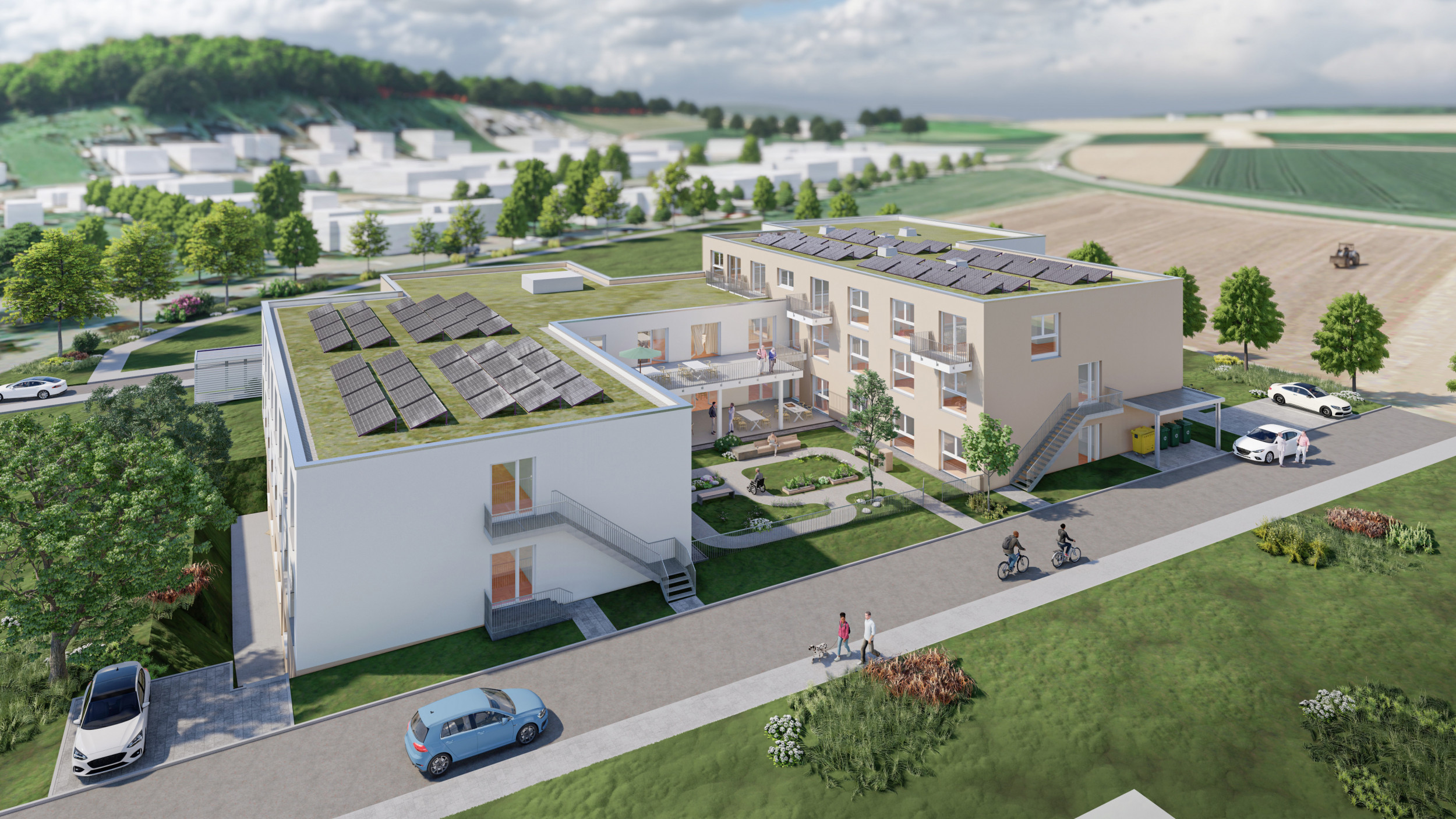 Das dreigeschossige Gebäude umfasst eine Bruttogrundfläche von rd. 4.545 m². Kernstück der Einrichtung ist die stationäre Pflegeeinrichtung. Im Erdgeschoss und im ersten Obergeschoss gibt es jeweils 2 Wohngruppen á 15 Bewohner:innen. Die Einzelzimmer haben eine Wohnfläche von rund 22 m² und ein eigenes großzügiges Duschbad, das uneingeschränkt mit dem Rollstuhl nutzbar sein wird. Bodentiefe doppelflügelige Fenster sorgen für lichtdurchflutete Räume, steigern die Wohnqualität und ermöglichen einen freien Blick nach draußen. Großzügige Wohnküchen und Gemeinschaftsräume mit Freisitz (Terrasse oder Balkon) sowie ein geschützter Außenbereich laden zum Verweilen außerhalb des eigenen Zimmers ein.