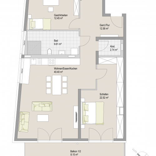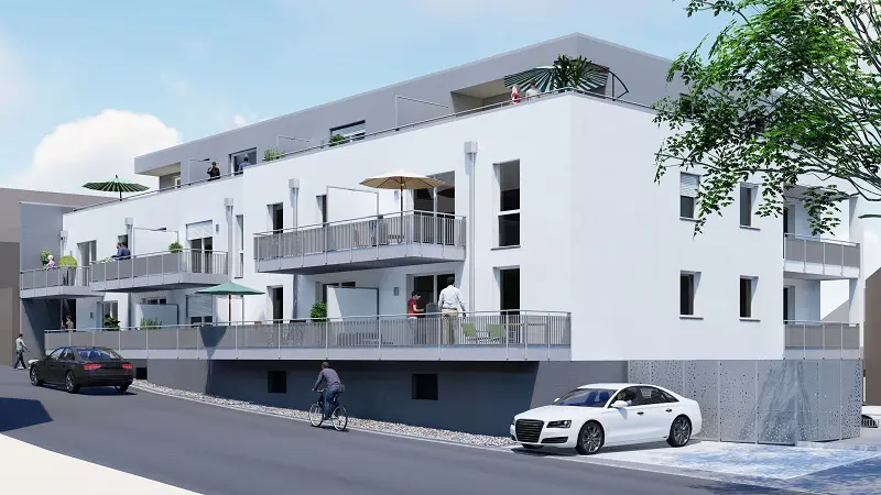 Im Erd- und Obergeschoss sowie im Staffelgeschoss werden insgesamt 15 Wohnungen mit 2- bis 3 Zimmern unterschiedlicher Größe, barrierefrei nach der DIN 18040-2 (Mindeststandard), bezugsfertig ausgeführt.