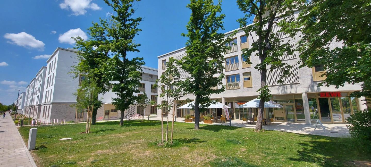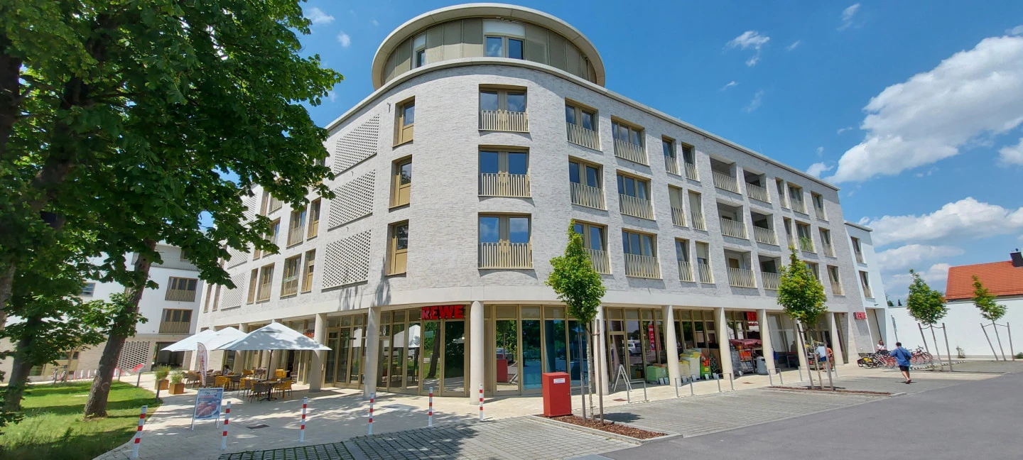Wohnanlage mit 101 Wohnungen, zweistöckiger Tiefgarage, REWE-Einkaufsmarkt und Gastro / Bäckerei
